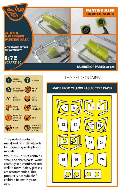 Clear Prop 1/72, K-8/JL-8 Karakorum double-sided painting mask on "yellow kabuki paper" for Trumpeter kit
